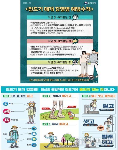 추석은 야외활동이 많은 시기로 진드기의 활동 시기와 겹쳐 감염 위험이 커지는 만큼, 야외에서는 긴소매와 긴 바지를 착용해 피부 노출을 줄이고 기피제를 사용하며, 벌초·성묘 후에는 샤워와 의류 세탁을 통해 몸에 붙은 진드기를 제거하는 등 예방수칙을 철저히 지켜야 한다.