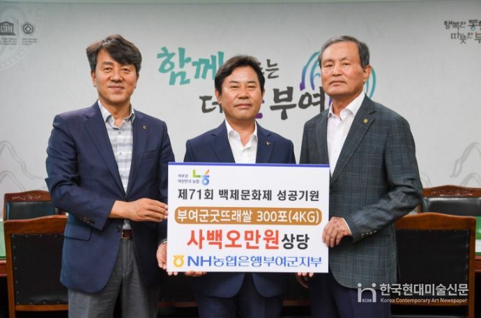 한국현대미술신문 신정은 기자 | 부여군은 지난 9월 22일 군수실에서 제71회 백제문화제의 성공적인 개최를 기원하는 NH농협은행 부여군지부(지부장 류경환) 기부금 전달식을 진행했다.