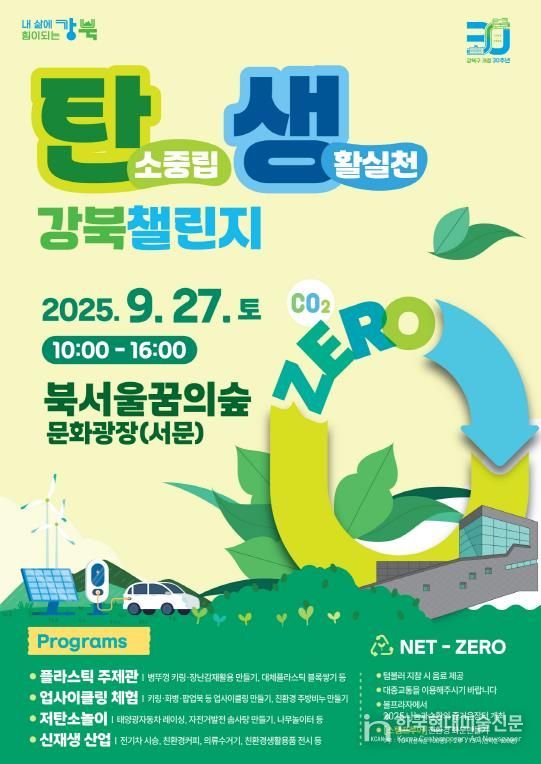 ‘탄생 강북 챌린지’의 ‘탄생’은 ‘탄소중립 생활실천’의 줄임말로 이번 행사는 탄소중립 실천 약속을 비롯해 플라스틱 주제관 등 5개 마당 35개 체험 프로그램으로 구성된다.