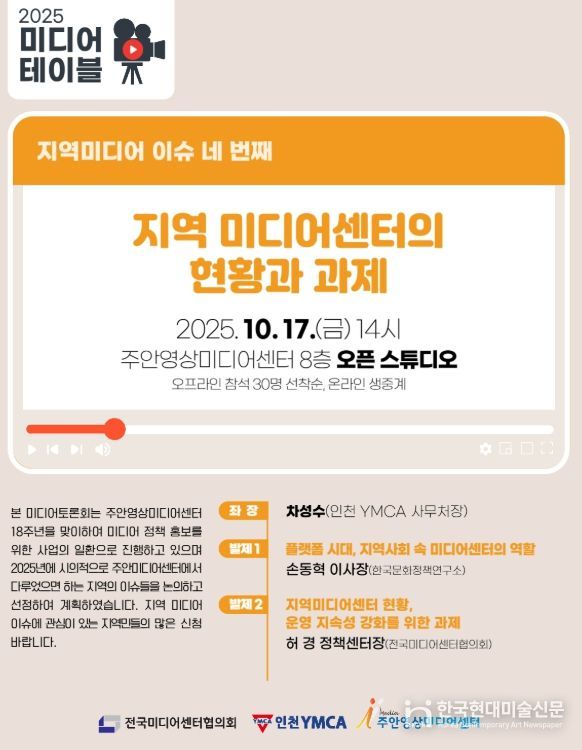 한국현대미술신문 박재남 기자 | 인천 미추홀구 주안영상미디어센터는 오는 10월 17일 오후 2시 센터 오픈 스튜디오에서 ‘미디어 테이블: 지역 미디어센터의 현황과 과제’ 토론회를 개최한다.