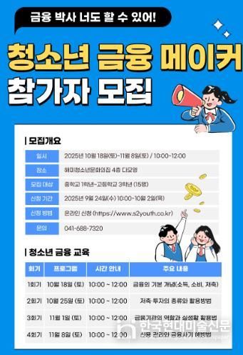 한국현대미술신문 신정은 기자 | 해미청소년문화의집은 오는 24일부터 2025년 청소년 특성화 프로그램‘청소년 금융 메이커’참가자를 모집한다고 밝혔다.
