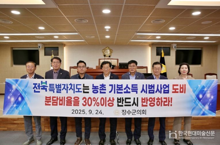 한국현대미술신문 기자 | 장수군의회는 24일 본회의장에서 의원 전원이 참석한 가운데 농어촌 기본소득 국가 시범사업 추진 과정에서 도비 분담비율을 반드시 30% 이상 반영할 것을 전북특별자치도에 강력히 촉구했다.