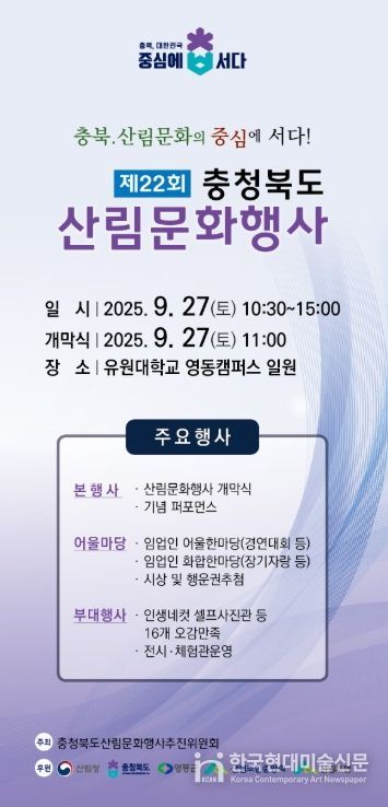 한국현대미술신문 신정은 기자 | 제22회 충청북도 산림문화행사가 오는 27일 오전 10시 30분부터 영동군 유원대학교 영동캠퍼스 일원(영동읍 대학로 310)에서 열린다.