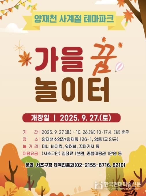 한국현대미술신문 배건 기자 | 서울 서초구는 지난 여름 큰 사랑을 받았던 양재천 수영장을 가을을 맞아 오는 27일부터 어린이 테마파크인 ‘가을꿈놀이터’로 운영한다고 밝혔다.