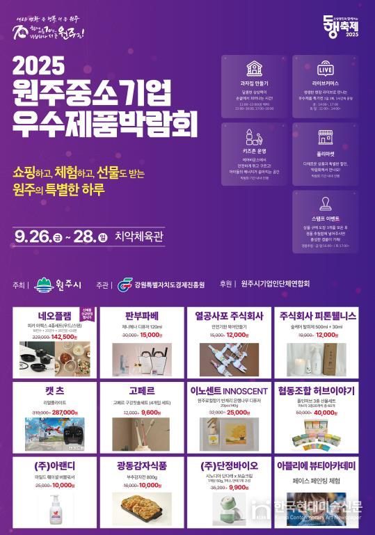 한국현대미술신문 원진 기자 | 원주시가 주최하고 강원특별자치도경제진흥원이 주관하는 ‘2025 원주 중소기업 우수제품 박람회’가 오는 26일 오전 10시 30분, 치악체육관 무대에서 개막식을 열고 28일까지 3일간 이어지는 행사의 막을 올린다.