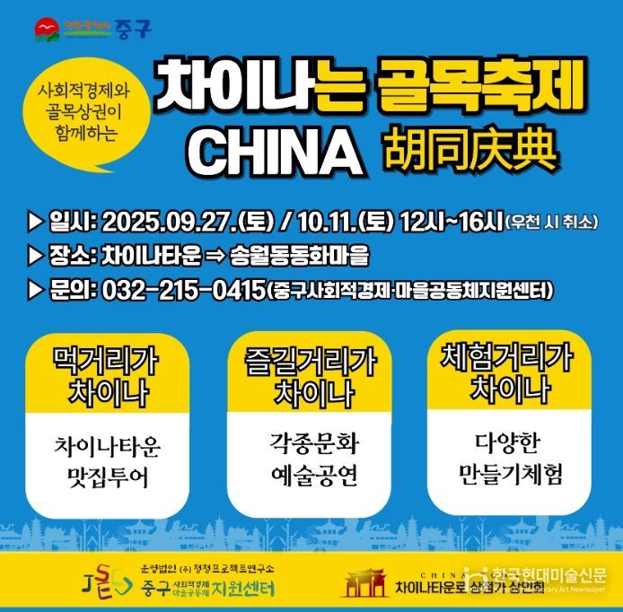 한국현대미술신문 박재남 기자 | 인천 중구 사회적경제·마을공동체 지원센터는 올해 9월부터 11월까지 인천 차이나타운·동화마을 일원에서 ‘2025년도 사회적경제와 골목상권이 함께하는 '차이나는 골목축제'’를 개최한다고 25일 밝혔다.