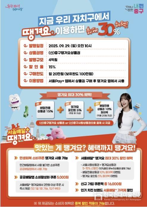 한국현대미술신문 배건 기자 | 서울 중구가 오는 29일 오전 10시, 총 4억원 규모의 ‘(신)중구땡겨요상품권’을 발행한다.