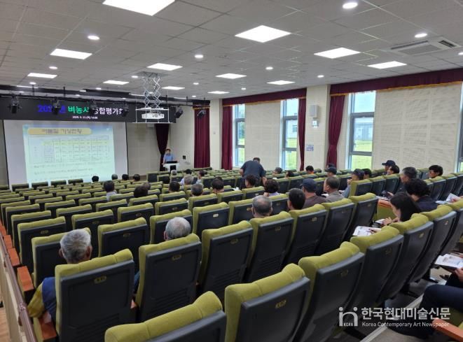 한국현대미술신문 기자 | 군산시농업기술센터는 지난 25일 3개 벼농사 시범사업 단지·쌀 채종포단지·선도농업인·농업인상담소장 등 80여 명이 참석한 가운데 ‘2025년 벼농사 종합 평가회’를 농업인평생학습센터 강당에서 개최했다.