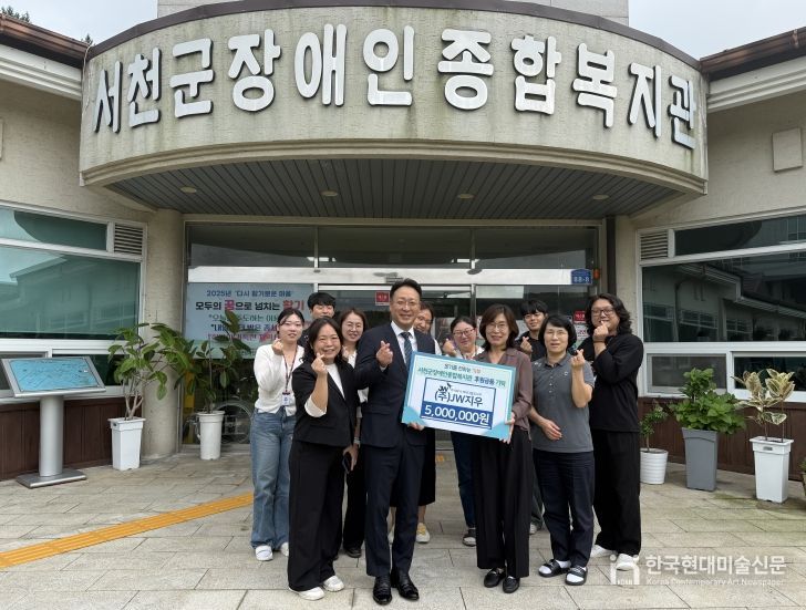 한국현대미술신문 신정은 기자 | ㈜제이더블유지우(대표이사 방현우)는 25일 서천군장애인종합복지관에 장애인을 위한 후원금을 기탁했다.