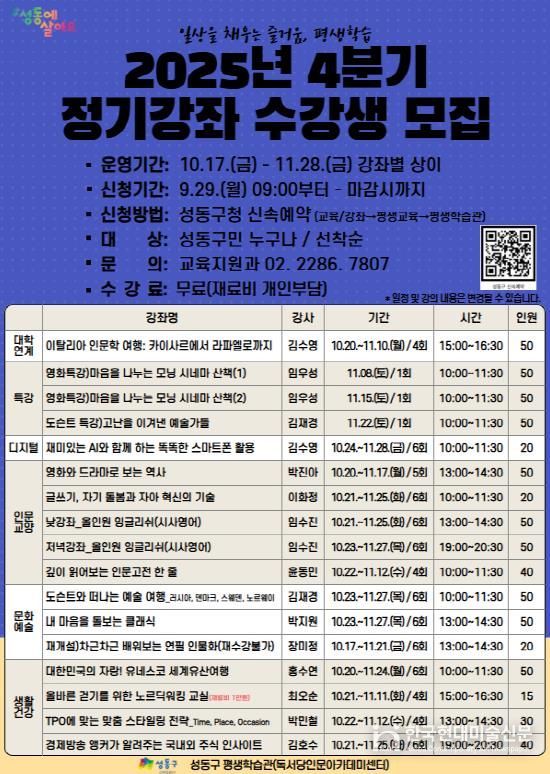 한국현대미술신문 배건 기자 | 서울 성동구가 2025년 4분기 평생학습관 정기강좌 수강생을 오는 9월 29일(월) 오전 9시부터 성동구청 누리집(홈페이지) 신속예약에서 선착순으로 모집한다.