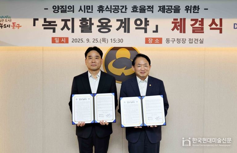 한국현대미술신문 박재남 기자 | 인천 동구는 지난 25일 동원로엑스㈜(인천㈜ 대표이사 최안석)와‘녹지활용계약’을 체결했다고 밝혔다. 인천 최초로 진행된 이번 계약은 민간기업이 소유한 사유지를 주민에게 열린 녹지로 제공하는 새로운 방식의 민관 협력 모델이다.