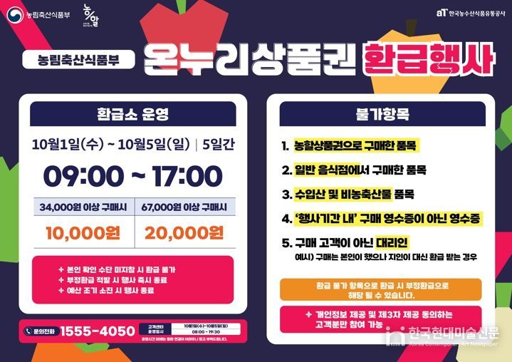 환급은 각 시장 내 환급 부스에서 진행되며, 기본 운영시간은 오전 9시부터 오후 5시까지이나 시장별 사정에 따라 다르므로 농축산물 할인 지원 누리집을 참고하면 된다.