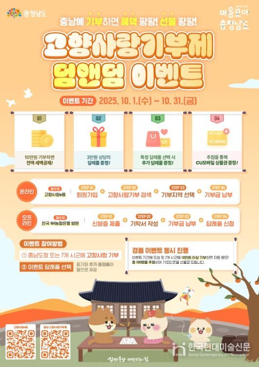 한국현대미술신문 신정은 기자 | 충남도는 천안·공주·보령·금산·서천·청양·예산 7개 시군과 10월 한 달간 ‘추석맞이 고향사랑 덤앤덤 이벤트’를 실시한다고 29일 밝혔다.