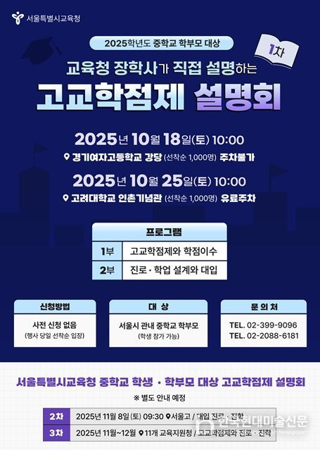 한국현대미술신문 배건 기자 | 서울시교육청은 고교학점제에 대한 이해도를 높이고 학생들의 진로·학업 설계를 돕기 위하여, 2025학년도 중학교 학부모를 위한 고교학점제 설명회를 개최한다.