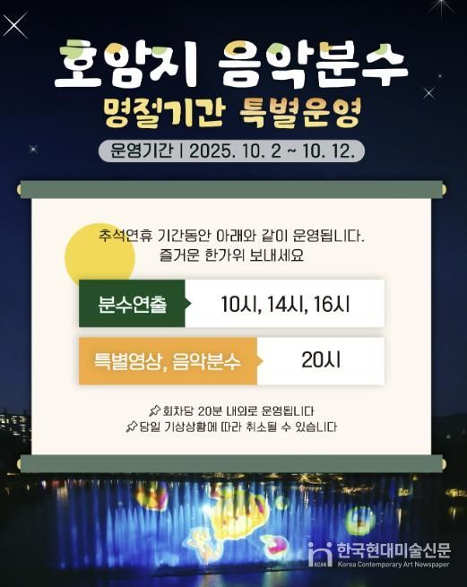 한국현대미술신문 신정은 기자 | 충주시는 도심 속 이색 명소로 자리매김한 호암지 음악분수의 가을철 운영 일정을 조정해 시민과 관광객들에게 한층 다채로운 볼거리를 제공한다고 밝혔다.