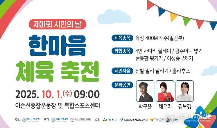 한국현대미술신문 신정은 기자 | 아산시는 오는 10월 1일 이순신종합운동장에서 ‘제31회 시민의 날 한마음 체육축전’을 개최한다.