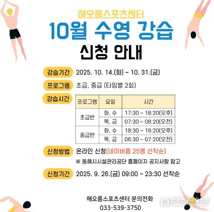 9월 강습이 조기 마감된 데 이어, 10월 강습 접수는 9월 26일 오전 9시부터 동해시시설관리공단 홈페이지에 안내되는 네이버 폼 링크를 통해 선착순으로 진행될 예정이다.