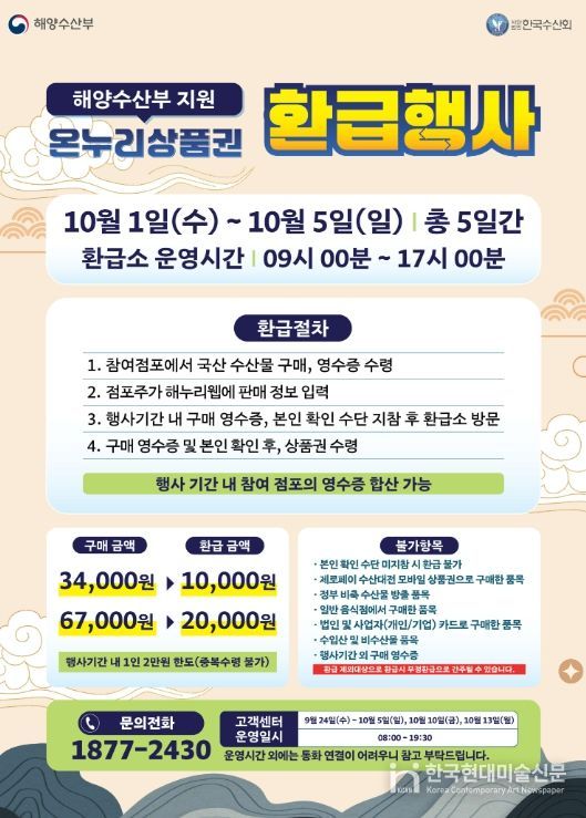 한국현대미술신문 신정은 기자 | 서천군은 추석 명절을 맞아 오는 10월 1일부터 5일까지 서천특화시장 내 행사 부스에서 ‘추석 온누리상품권 환급행사’를 진행한다.