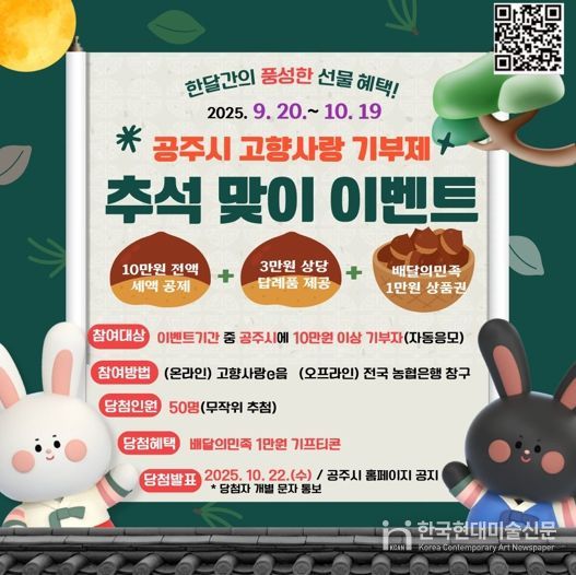 한국현대미술신문 신정은 기자 | 공주시는 추석을 앞두고 고향사랑기부 모금 활성화를 위해 ‘추석맞이 이벤트’를 진행한다고 29일 밝혔다.