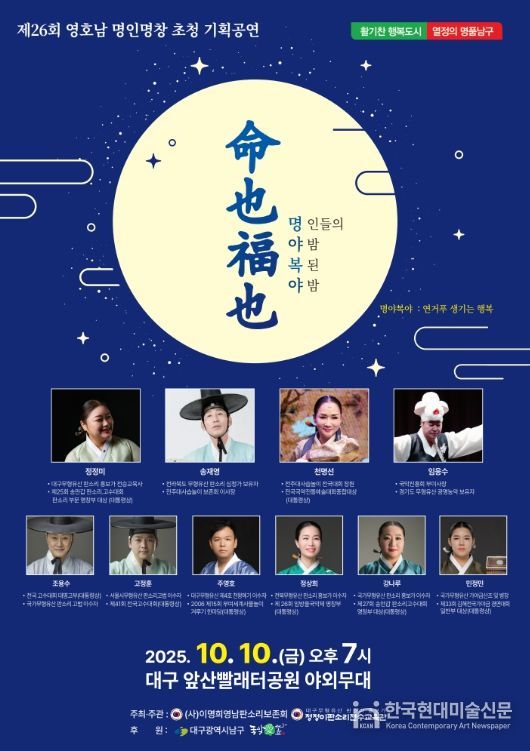 한국현대미술신문 정소영 기자 | 대구 남구는 이번 추석 연휴 기간인 10월 10일 오후 7시 남구 앞산빨래터공원 야외무대에서 (사)이명희영남판소리보존회 주최로 제26회 영호남 명인명창 초청 기획공연 '명야복야(命也福也)'를 개최한다고 밝혔다.