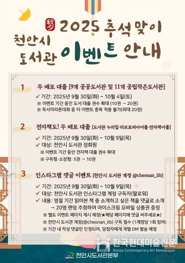한국현대미술신문 신정은 기자 | 천안시도서관본부는 추석 연휴를 맞아 다양한 독서 이벤트를 운영한다고 29일 밝혔다.