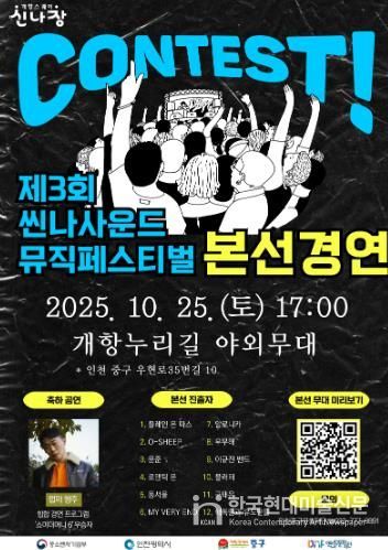 한국현대미술신문 박재남 기자 | (재)인천중구문화재단은 오는 10월 25일 오후 5시 인천 중구 개항누리길 야외무대에서 ‘제3회 씬나사운드 뮤직 페스티벌’ 본선 경연을 개최한다고 밝혔다.