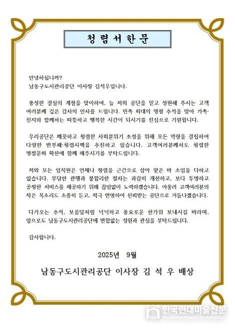 한국현대미술신문 박재남 기자 | 인천시 남동구 도시관리공단은 청렴 문화 정착을 위해 공사, 용역, 물품 관련 업체와 전 직원에게 ‘청렴 서한문’을 발송했다고 29일 전했다.
