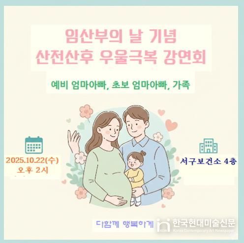 한국현대미술신문 박재남 기자 | 인천 서구는 ‘제20회 임산부의 날’을 기념하여 임산부와 가족을 위한 ‘산전·산후 우울증 극복’이라는 주제로 서구보건소에서 특별 강좌를 개최한다고 밝혔다.