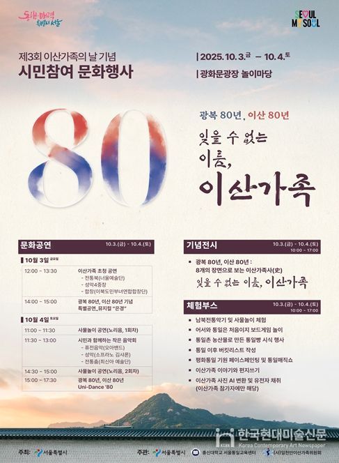 한국현대미술신문 배건 기자 | 서울시는 오는 10월 3일부터 10월 4일까지 광화문광장 놀이마당에서 제3회 이산가족의 날을 맞아 시민참여 문화행사를 개최한다.