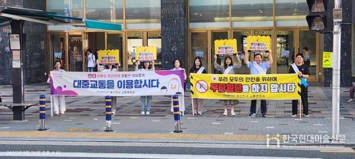 한국현대미술신문 정소영 기자 | 부산진구는 추석을 맞아 24일, 25일 이틀에 걸쳐 보행자 통행량이 많은 부전시장과 서면롯데백화점 앞에서 ‘무단횡단 금지, 교통안전 캠페인’을 실시했다.