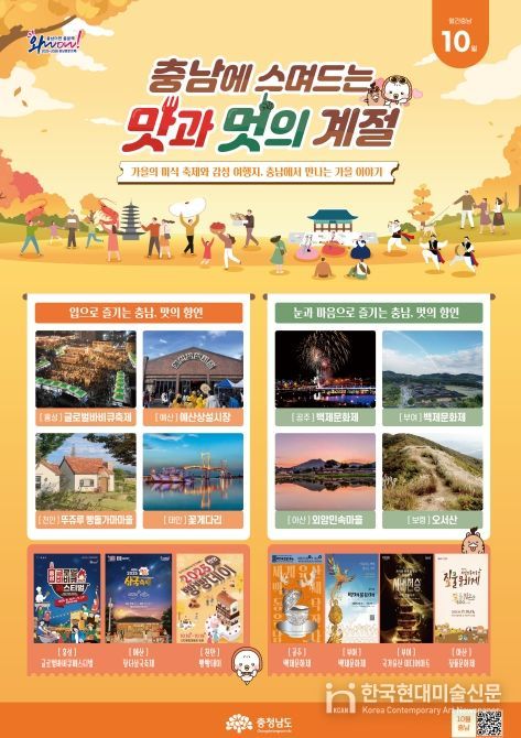 한국현대미술신문 신정은 기자 | 충남도가 ‘2025∼2026 충남 방문의 해’를 맞아 운영 중인 ‘월간 충남’을 통해 ‘충남에 스며드는 맛과 멋의 계절’이라는 주제로 10월 가볼 만한 도내 여행지를 안내한다.