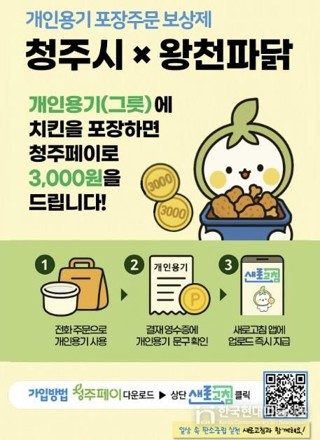 한국현대미술신문 신정은 기자 | 청주시는 10월 1일부터 ‘새로고침’ 모바일앱을 통해 전국 최초 개인용기 포장주문 보상제를 시행한다. 참여자에게는 지역화폐인 청주사랑상품권(청주페이) 3천원이 보상으로 지급된다.