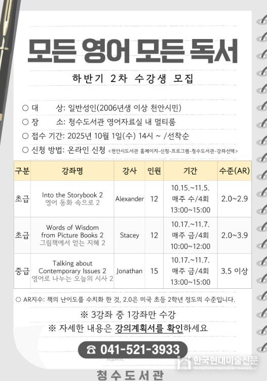 한국현대미술신문 신정은 기자 | 천안시 청수도서관은 내일 1일부터 성인 영어 프로그램 ‘모든 영어 모든 독서’ 수강생을 모집한다고 30일 밝혔다.