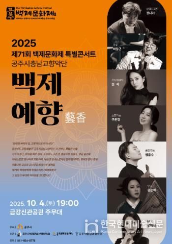 한국현대미술신문 신정은 기자 | 공주시충남교향악단은 제71회 백제문화제를 맞아 오는 10월 4일 저녁 7시, 공주 금강신관공원 주무대에서 특별콘서트 ‘백제 예향’을 개최한다고 밝혔다.
