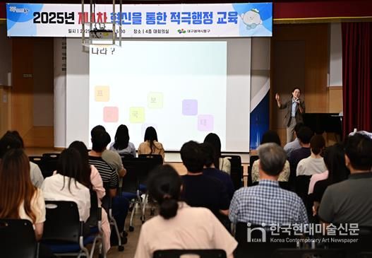 한국현대미술신문 정소영 기자 | 대구 동구청은 지난 26일, 동구 소속 공무원과 (재)동구문화재단 직원 포함 80여 명을 대상으로 ‘제1차 혁신을 통한 적극행정 교육’을 실시했다.