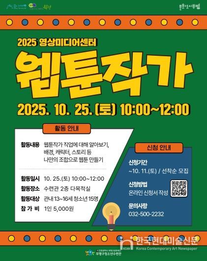 한국현대미술신문 박재남 기자 | 부평구 청소년수련관은 오는 10월 11일까지 영상미디어센터 10월 일일특강 ‘웹툰작가 직업 특강’의 참가자를 모집한다.