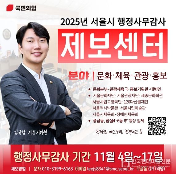 한국현대미술신문 배윤섭 기자 | 김규남 서울시의원(송파1·국민의힘)은 오는 11월 4일부터 17일까지 열리는 2025년도 서울시 행정사무감사를 앞두고 시민 참여를 위한 제보센터를 운영한다고 30일 밝혔다.