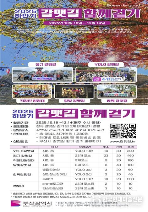 한국현대미술신문 정소영 기자 | 부산시는 오는 10월 18일부터 12월 14일까지 두 달여 간 '2025년 하반기 욜로(YOLO) 갈맷길 함께 걷기 행사'를 운영한다고 밝혔다.