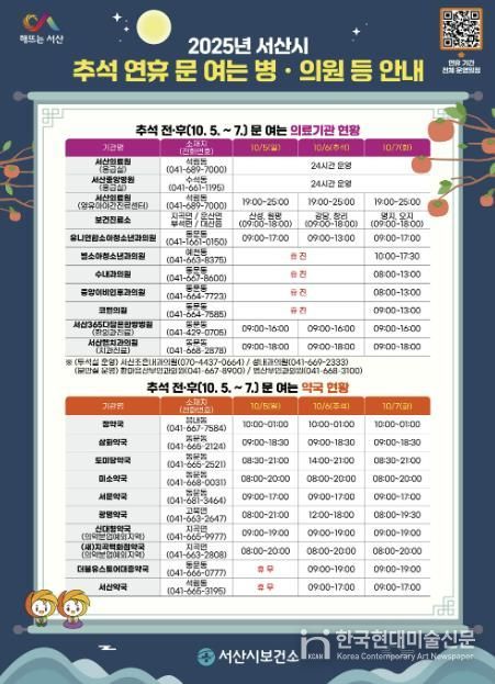 한국현대미술신문 신정은 기자 | 충남 서산시가 추석 연휴 진료 공백 해소를 위해 오는 10월 3일부터 9일까지 7일간 추석 연휴 응급진료체계를 운영한다고 밝혔다.