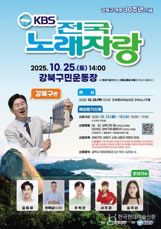 한편 사전 예선은 10월 23일 강북문화예술회관 소나무홀에서 진행되며 10월 13일(월)부터 15일(수)까지 접수를 받는다. 참가 대상은 강북구민과 강북구 소재 사업자·직장인·학생이며 모집 규모는 총 300팀으로, 방문 200팀과 온라인 100팀을 선착순으로 접수 받는다. 방문 접수는 강북구청 1층 접수처에서 가능하며, 온라인 접수는 강북구 통합예약시스템을 통해 예약한 뒤 신청서를 별도로 제출해야 한다. 단, 기성 가수는 참가할 수 없다.