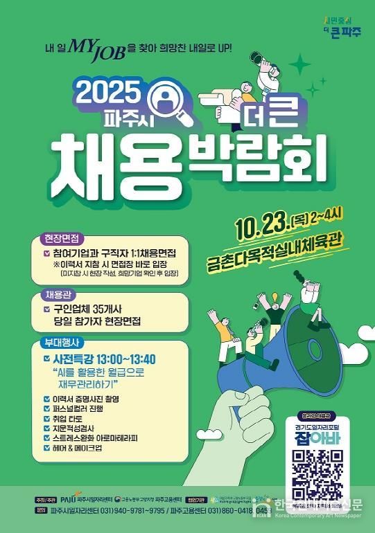 한국현대미술신문 배윤섭 기자 | 파주시는 오는 10월 23일 금촌다목적실내체육관 2층에서 ‘2025년 파주시 더 큰 채용박람회’를 개최한다고 밝혔다. 이에 앞서 행사에 참여할 구직자를 10월 1일부터 17일까지 모집한다.