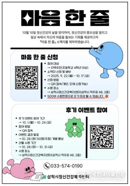 한국현대미술신문 원진 기자 | 삼척시정신건강복지센터는 10월 10일 ‘정신건강의 날’을 기념하고 정신건강 주간(10월 10일 전후 1주간)을 맞아 지역 주민의 정신건강 인식 향상과 마음 돌봄의 중요성을 알리기 위해 ‘마음 한 줄’ 캠페인을 진행한다.