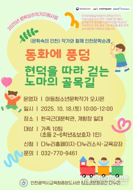 한국현대미술신문 박재남 기자 | 인천광역시교육청중앙도서관은 10월 18일 오전 10시부터 12시까지 오시은 상주작가와 함께하는 인천문학순례를 운영한다.