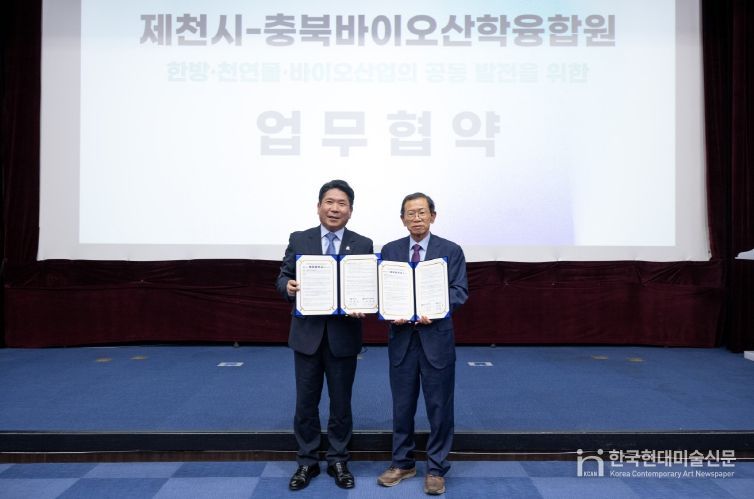 한국현대미술신문 신정은 기자 | 제천시는 9월 30일 ‘2025 제천국제한방천연물산업엑스포’ 기간 중 한방생명과학관 다목적강당에서 충북바이오산학융합원과 한방·천연물산업 발전을 위한 업무협약(MOU)을 체결했다.