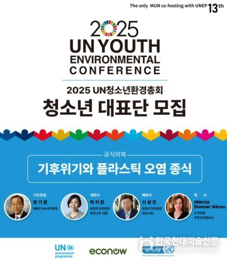 한국현대미술신문 배윤섭 기자 | 성남시청소년청년재단 판교유스센터와 환경단체 에코나우는 오는 11월 15일부터 16일까지 이틀간 성남 국립국제교육원에서 열리는 ‘2025 UN청소년환경총회’에 참가할 국내외 청소년 대표단 300명을 10월 13일까지 모집한다. 이번 총회는 성남시청소년청년재단 판교유스센터와 환경단체 에코나우가 공동 주관하며, 반기문 전 UN사무총장과 브라질 대사 등 주요 인사가 참석한다.