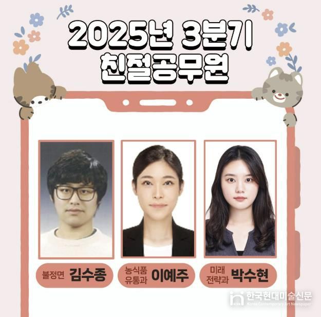 한국현대미술신문 신정은 기자 | 충북 괴산군은 2025년 3분기 친절공무원으로 김수종 주무관(불정면사무소), 이예주 주무관(농식품유통과), 박수현 주무관(미래전략과)을 선정했다고 밝혔다.