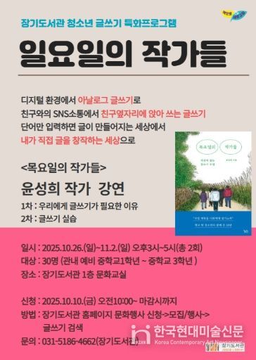 한국현대미술신문 배윤섭 기자 | 김포시 장기도서관은 청소년 글쓰기 특화프로그램으로 '일요일의 작가들'을 오는 10월 26일, 11월 2일 오후 3시부터 5시까지 장기도서관 1층 문화교실에서 운영한다고 밝혔다