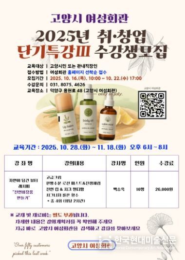 한국현대미술신문 배윤섭 기자 | 고양특례시 여성회관에서는 친환경과 건강을 중시하는 최신 트렌드를 반영한‘취창업 단기특강Ⅲ’수강생을 모집한다.
