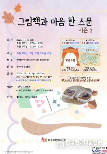 한국현대미술신문 배윤섭 기자 | 고양특례시 화정어린이도서관은 오는 11월 8일 ‘고소하고 향긋한 보늬밤 보틀케이크’를 만들어보는 그림책 동화요리 프로그램‘그림책과 마음 한 스푼-시즌2’를 운영한다.