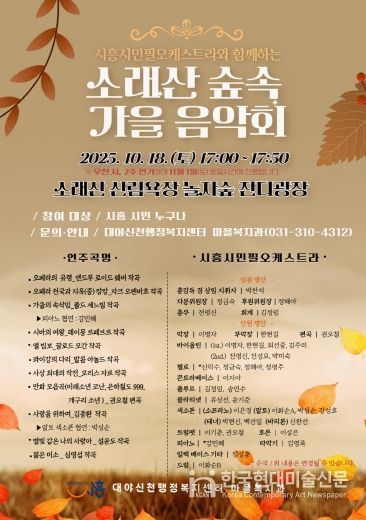 한국현대미술신문 배윤섭 기자 | 시흥시 대야ㆍ신천행정복지센터는 오는 10월 18일 소래산 삼림욕장 놀자숲 잔디광장에서 대야ㆍ신천동 지역 주민을 위한 ‘소래산 숲속 가을 음악회’를 개최한다.